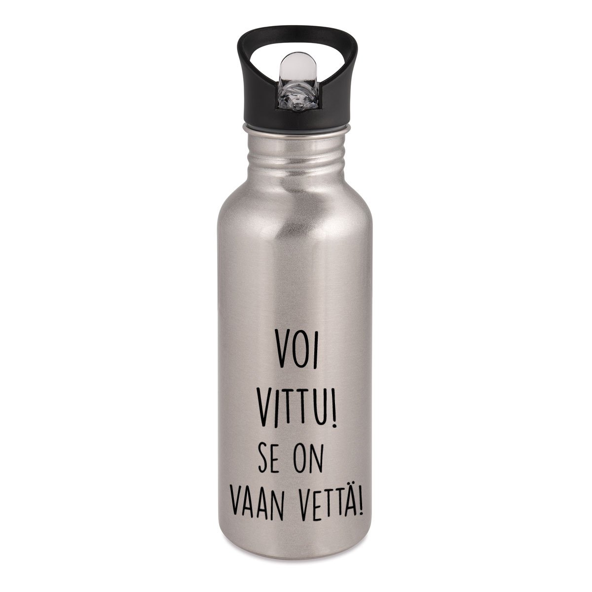 Teräksen värinen juomapullo pillillä. Tiivis, voit heittää sen huoletta kassin pohjalle.