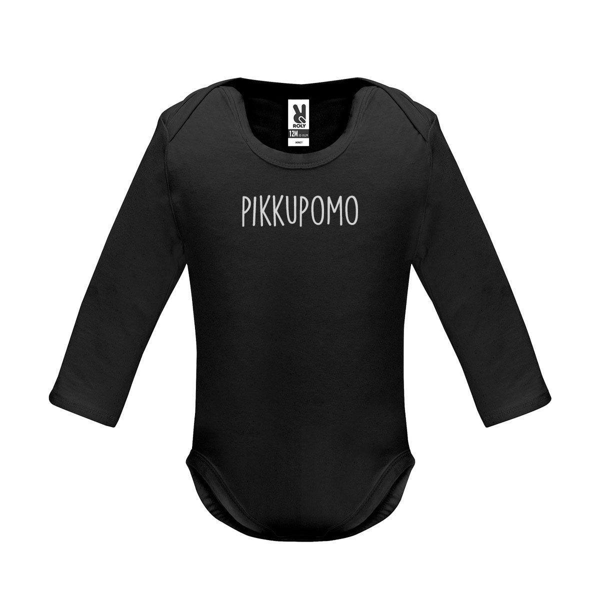 Musta pitkähihainen body, 96% harjattua puuvillaa, 4% elastaania, laskostetut olkasaumat, nepparit