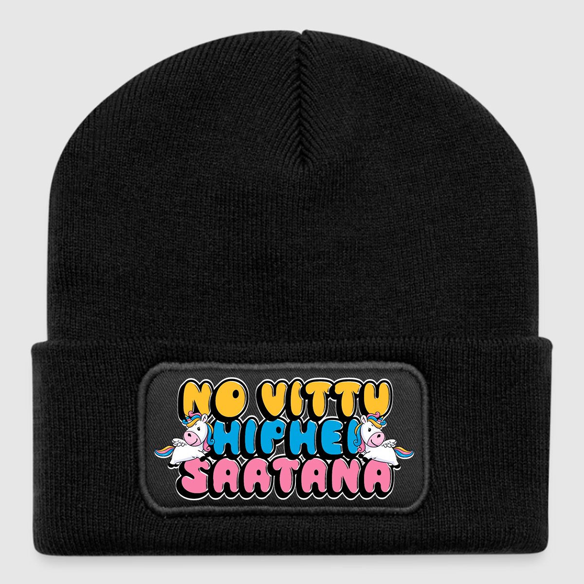 Ihastuttavan pirteä musta pipo riemukkaalla tekstillä ja yksisarvisen kuvalla.