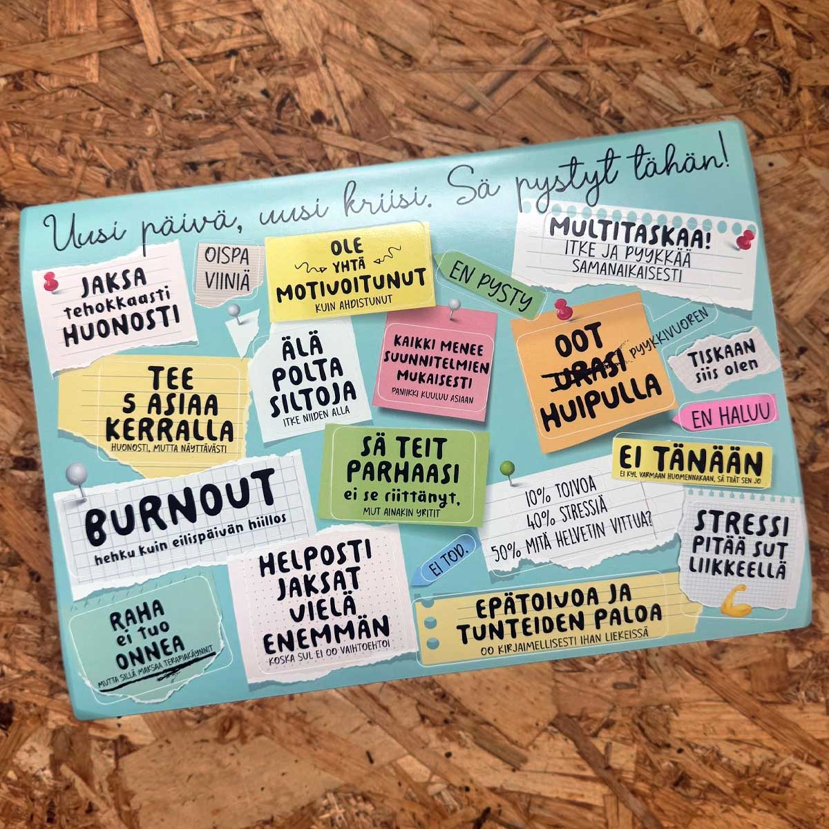 Uusi päivä, uusi kriisi! Tämä kaunis tarra-arkki sisältää 20 erilaista motivaatiotarraa sun päiviis. On burnouttia, pyykkivuorta ja viinin kaipuuta. Kaikenlaista, millä pääsee taas sen yhden päivän eteenpäin elämässä. Tarra-arkki on aanelkun kokoinen (kuvittele ihan tavallinen postissa tullut lasku, sen kokoinen) ja voit poimia siitä vaikka kalenteriin erilaisia tsemppilauseita.