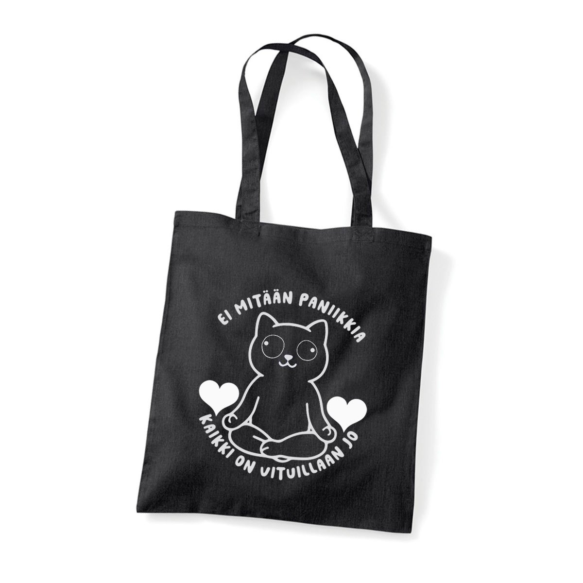 Ei mitään paniikkia, kaikki on vituillaan jo. Lisäksi siinä on joku ehkä joogaava kissa. Oi vau. Mutta pirteän musta kangaskassi se on! Painettu Paskakaupalla omin pikku kätösin, vittuuntuneena ja ahdistuneena, kuis muutenkaan. Mutta palvelua, suomalaista painopalvelua, meiltä saa, saatana!
